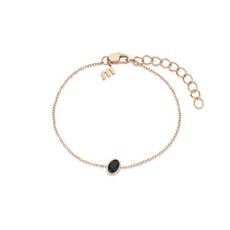 The Melano Friends Mini Oval bracelet is shown in a rose gold coloured plating with a Swarovski stone in the colour Jet Black. This fine bracelet is adjustable in the known sizes S/M/L and the bracelet has a total length of 20 cm. The stone itself has an extra detail: there’s a star engraved on the backside. In addition, the Friends bracelet has a Melano M-tag to finish off the look.
